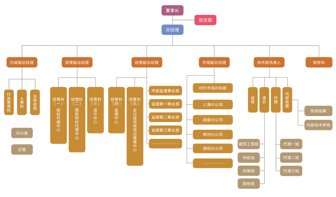 本公司总部设立于江苏,在成都、上海、溧阳设有分支机构。现有从业人员100多名,其中具有国家注册监理工程师20余 名、注册一级造价师10余名、注册一级建造师10余名、注册二级建造师10余名、高级工程师及工程师20余名,其他各类专职人员40余名。我公司在内部管理上已建立起一套完整的组织章程、规章制度和质量保证体系,实现了项目跟踪、质量控制、成本核算、业绩考核等规范管理。同时拥有一批经验丰富,业务水平高,恪守职业准则的技术人员。